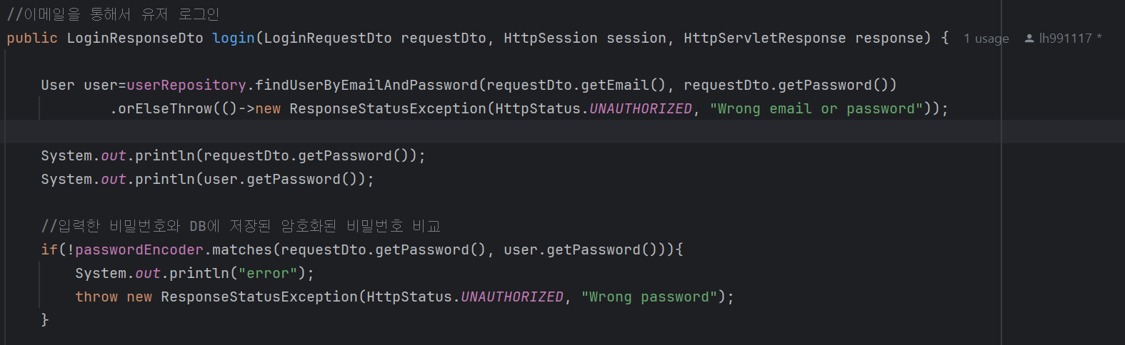: 이를 해결하기 위해서 먼저 email만 비교하는 findUserByEmail코드를 작성하고 그 후 비밀번호를 비교할 수 있도록 코드를 수정했다.